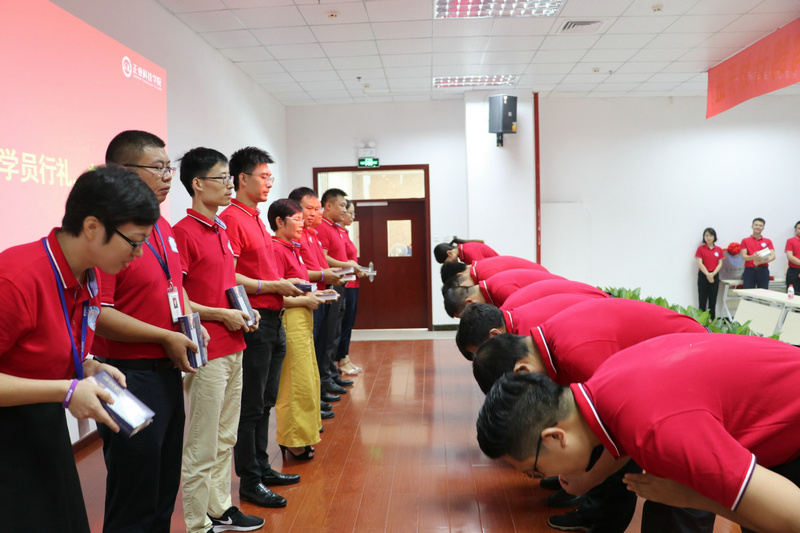 開(kāi)班儀式上舉行了莊嚴(yán)的拜師儀式,42位儲(chǔ)備高管分別給老師們行拱手禮,感謝老師們的悉心栽培,從此發(fā)奮圖強(qiáng),為公司的事業(yè)再創(chuàng)輝煌,老師們贈(zèng)書(shū)給學(xué)員作為回贈(zèng)。