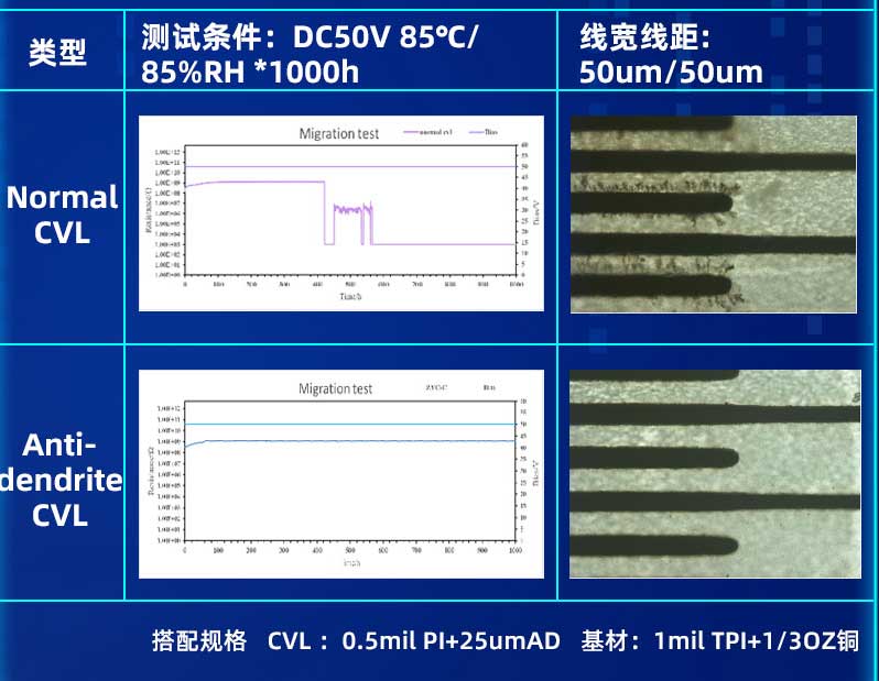 提高PCB基材的耐離子遷移性成為了電子產品開發(fā)中的迫切需求。因此,對于精細線路制程工藝,與之匹配的抗枝晶(Anti-dendrite)材料就顯得十分必要??怪Вˋnti-dendrite)材料的使用,能有效降低細線路間產生枝晶的風險,提高FPC的可靠性。